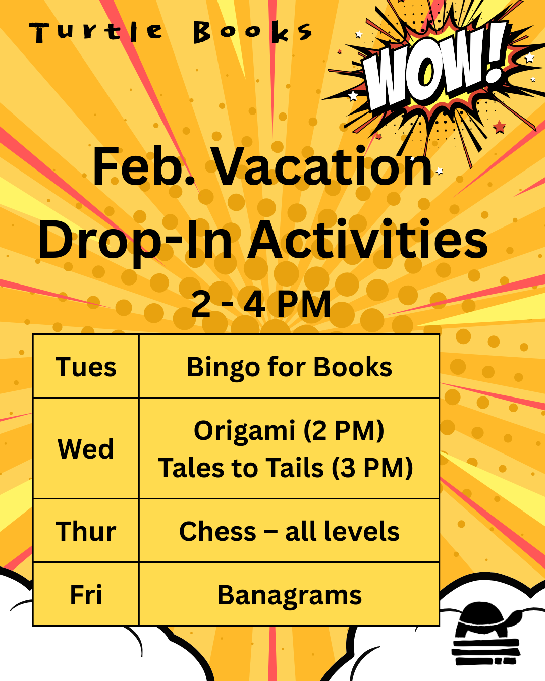 A weekly reading group for 1st to 3rd graders, for children that love to read and for new or reluctant readers. We'll be reading books about dogs to a real-live dog. Registration at Tales to Tails Reading Buddy Registration Dec 2025 – Turtle Books. |