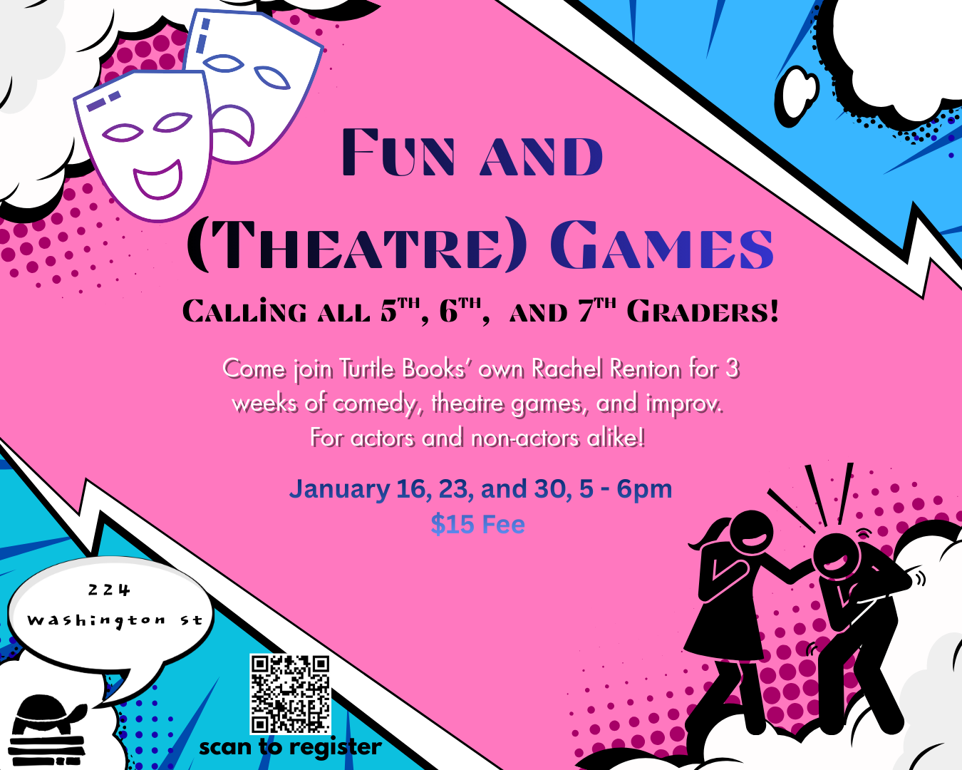 Calling all 5th, 6th, and 7th graders. Come join Rachel Renton for three weeks of comedy, theater games, and improv for actors and non-actors alike. $15 fee for three sessions. Register in advance required: https://turtlebooks.store/theater-arts-registration-dec-2025/. Pay at the door.