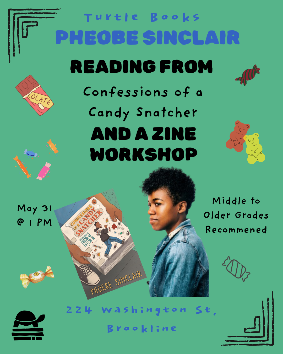Phoebe Sinclair reads from Confessions of a Candy Snatcher + Zine Workshop May 31 Phoebe Sinclair reads from Confessions of a Candy Snatcher + Zine Workshop 2:00 pm - 3:30 pm Readers